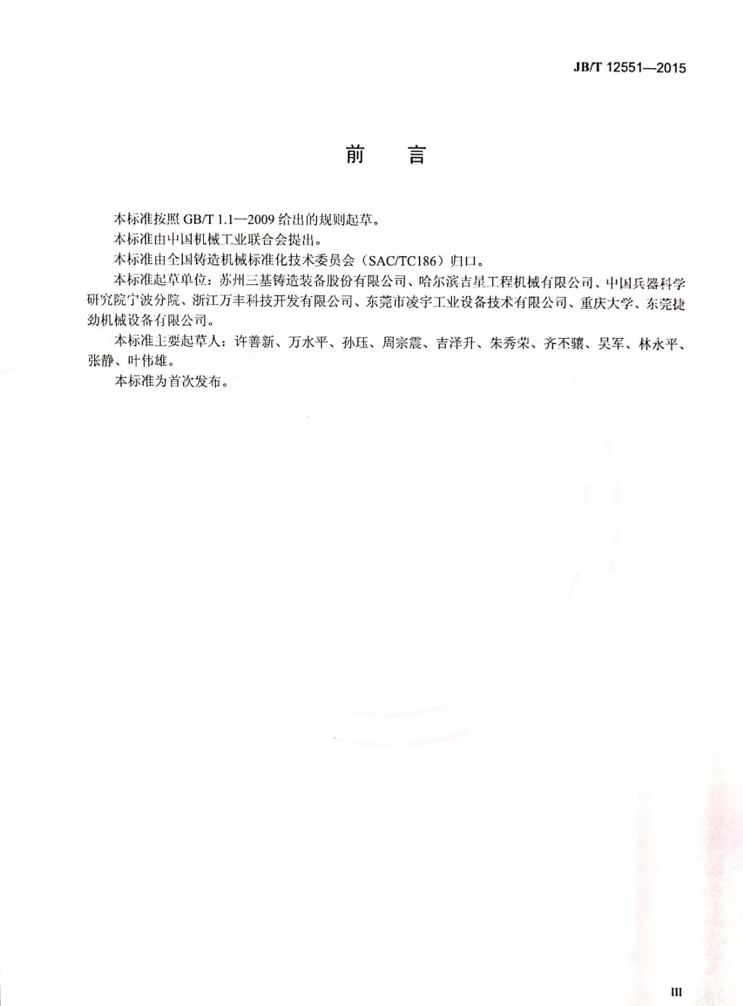 由蘇州三基鑄造裝備股份有限公司主持,哈爾濱吉星工程機械有限公司、中國兵器科學研究院寧波分院等單位參與制定的《擠壓鑄造機》行業(yè)標準于2015年10月10日發(fā)布,并于2016年3月1日起正式實施。該標準為國內(nèi)在擠壓鑄造領(lǐng)域制定的首個標準。