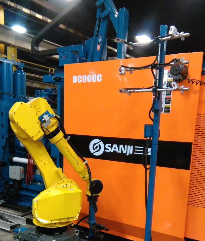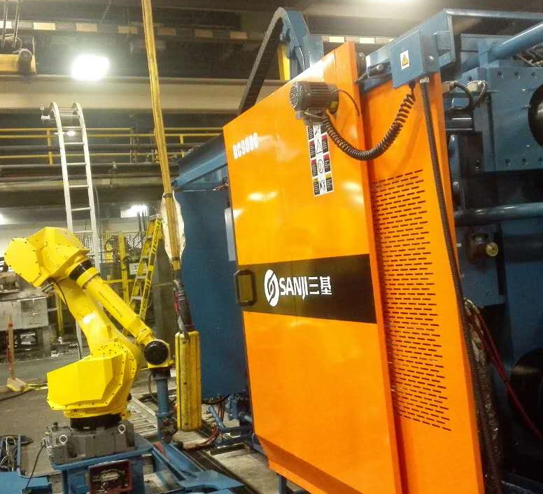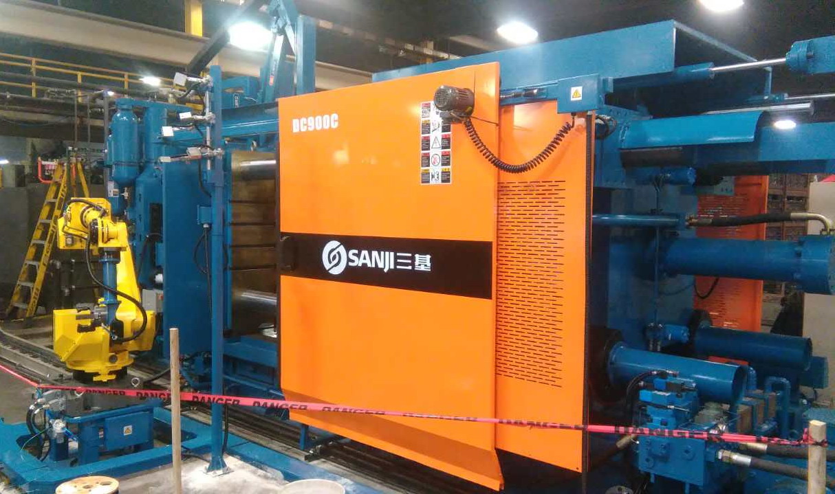 蘇州三基依照美國(guó)的UL認(rèn)證安全要求設(shè)計(jì)了歐美版臥式冷室壓鑄機(jī)系列產(chǎn)品,該產(chǎn)品在電氣控制系統(tǒng)、液壓油路、合模系統(tǒng)、機(jī)座系統(tǒng)等方面進(jìn)行了全新設(shè)計(jì),合模機(jī)構(gòu)的模板、曲肘系統(tǒng)全部采用鑄鋼件,大大提高了壓鑄機(jī)的整體剛性。其中900噸臥式冷室壓鑄機(jī)已于2016年10月份成功銷往美國(guó)市場(chǎng),該設(shè)備采用AB控制系統(tǒng)和美國(guó)VTW實(shí)時(shí)控制系統(tǒng),集成了給湯機(jī)、噴霧機(jī)、取件機(jī)器人、切邊機(jī)等自動(dòng)化設(shè)備,組建了一個(gè)自動(dòng)化壓鑄島,用于汽車零部件的自動(dòng)化生產(chǎn)。設(shè)備目前正處于安裝調(diào)試階段,將在2017年2月份正是達(dá)產(chǎn)。